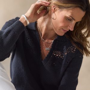 Subtle details make this allover rib sweater so special. with a hand-crocheted yoke and picot trim at V-neckline. Recycled wool/merino wool/cotton/nylon. Hand wash. Imported. Exclusive. Sizes XS (0–2). S (4–6). M (8–10). L (12–14). XL (16–18). XXL (20–22). Approx. 22l.
