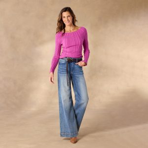 The newest silhouette in our Legends collection. our mixed rib. fitted sweater has a graceful bateau neckline and subtle bell sleeves. Fashioned from Legends Lightweight Yarn. it’s soft. stretchy and so flattering. Makes a perfect layering piece. Organic cotton/Lycra. Machine wash. Imported. Exclusive. Sizes XXS (00). XS (0–2). S (4–6). M (8–10). L (12–14). XL (16–18). Approx. 21l.