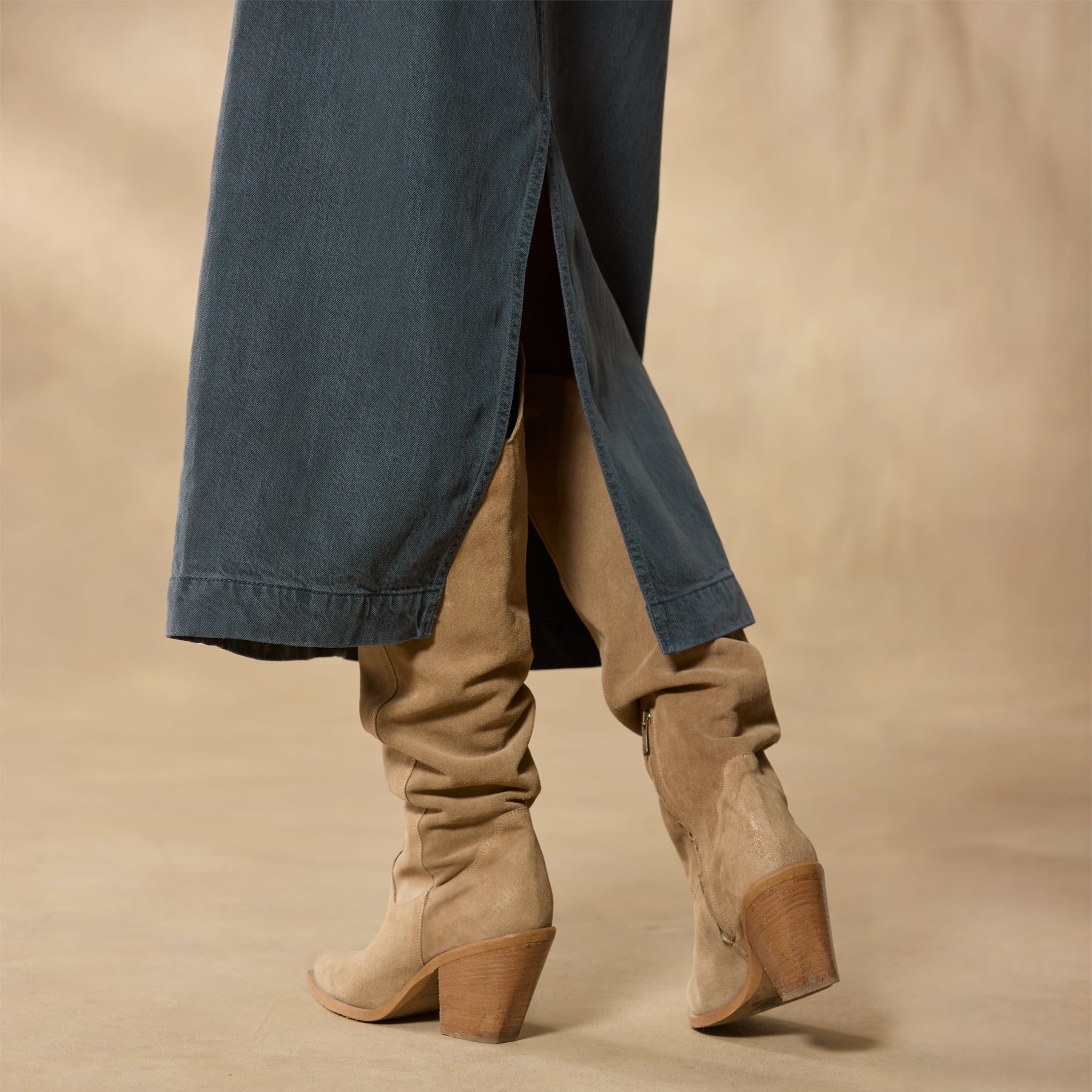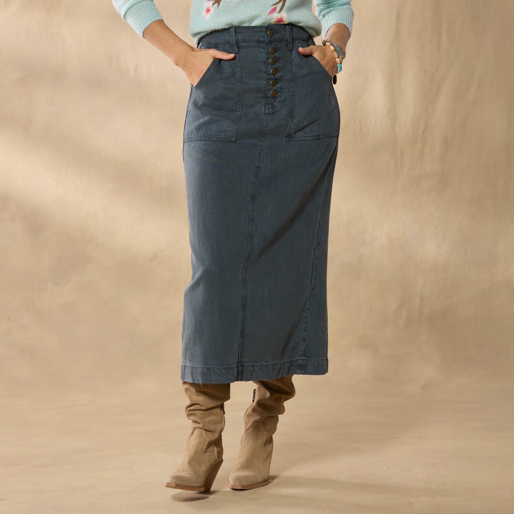 An instant everyday staple. our Bosque Skirt features an ultra-wearable midi length with a button fly. front patch pockets and a back slit. Tencel/linen/cotton. Machine wash. Imported. Exclusive. Sizes 24?C32. Approx. 32.5l.