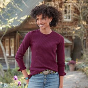 Take our crewneck thermal shirt with wide cuffs. velvet-trimmed and metal-buttoned. and create a go-to wardrobe you’ll wear this season and next. It’s made of soft. waffle-knit cotton with shape-retaining spandex. Machine wash. Imported. Exclusive. Sizes XS (0 to 2). S (4 to 6). M (8 to 10). L (12 to 14). XL (16 to 18). XXL (20 to 22). Approx. 25-1/2L.