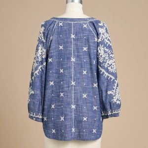 There’s joyful bohemian flair in this yarn-dyed top with luscious allover embroidery. blanket stitch details. three-quarter sleeves. shell buttons and V-neck. Full. easy fit. Cotton. Machine wash. Imported. Exclusive. Sizes XS (0 to 2). S (4 to 6). M (8 to 10). L (12 to 14). XL (16 to 18). XXL (20 to 22). Approx. 24-1/2L.