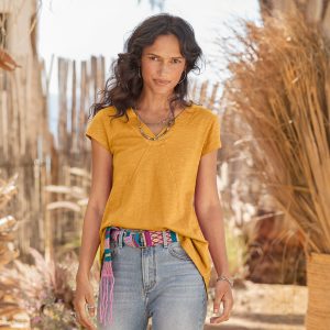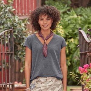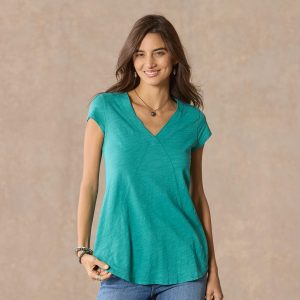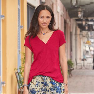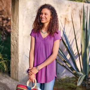 Comfy every day. this tee boasts subtle. directional seaming that flatters. V-neck and rounded. hi-lo hem. Cotton slub. Machine wash. Imported. Sizes XS (0-2). S (4–6). M (8–10). L (12–14). XL (16-18). XXL (20–22). Approx. 29.75l.