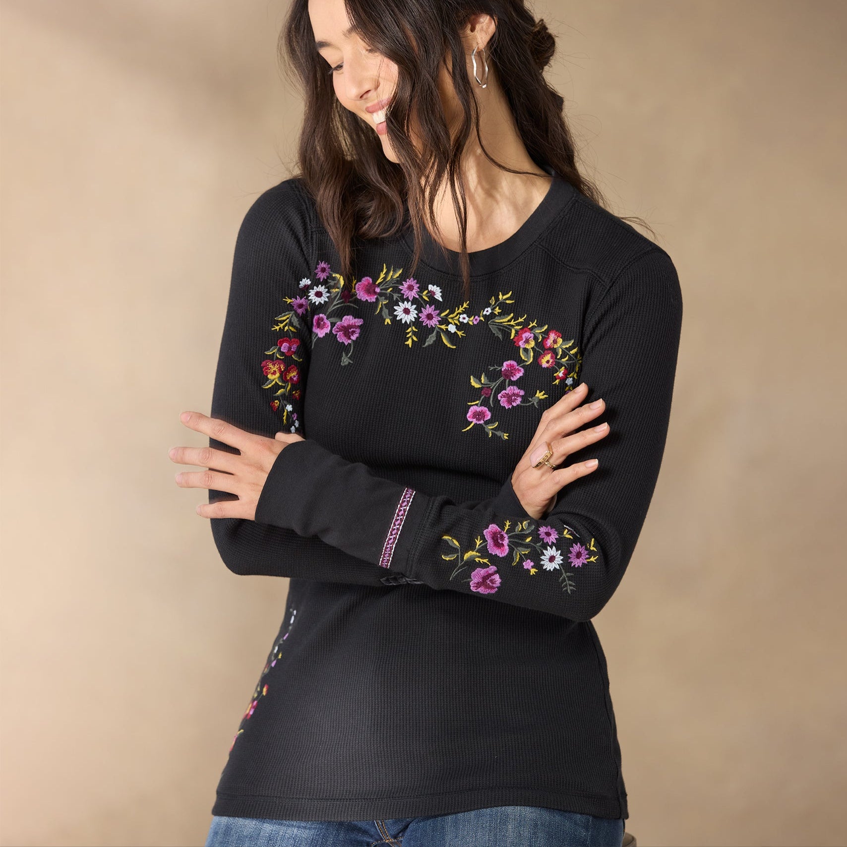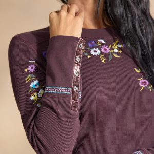 A Sundance classic body in new floral embroidery. our comfortable crewneck thermal boasts wide cuffs accented with velvet trim detail and metal buttons. Cotton/spandex. Machine wash. Imported. Exclusive. Sizes XS (0–2). S (4–6). M (8–10). L (12–14). XL (16–18). XXL (20–22). Approx. 25.5l.
