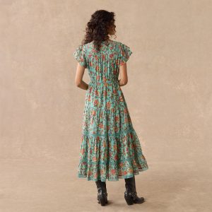 Feminine and flowing. a palette of gorgeous florals with contrast border print details. pintucking. elastic waist. double flutter sleeves and tiered hem. Fully lined. Cotton/silk. Hand wash. Imported. Exclusive. Sizes XXS (00). XS (0–2). S (4–6). M (8–10). L (12–14). XL (16–18). Approx. 49.5l.