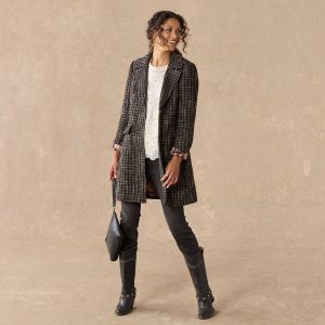 Our ladylike coat is slightly fitted. in a slubby plaid. with three-button closure. flap pockets and a standout floral lining. Soft and comfortable. midi-length. with a nice A-line shape. Wool/polyester. Dry clean. Imported. Exclusive. Sizes XXS (00). XS (0?C2). S (4?C6). M (8?C10). L (12?C14). XL (16?C18). Approx. 35l.