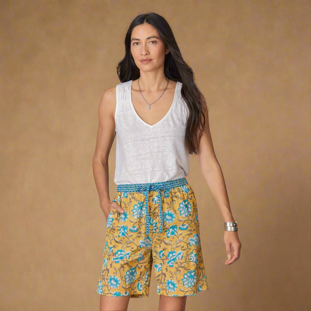 Vibrant prints add joy to our relaxed. high rise shorts with contrast print under the drawstring. Cotton. Machine wash. Imported. Exclusive. Sizes XXS (00). XS (0-2). S (4-6). M (8-10). L (12-14). XL (16-18). 6.25 inseam.