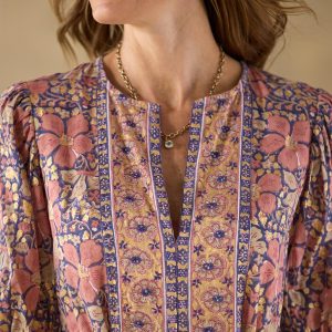 This handcrafted maxi dress features a metallic floral print with contrasting border print. elbow-length puff sleeves. a pull-over style and a self-tie belt. Cotton. Machine wash. Imported. Sizes XS (0?C2). S (4?C6). M (8?C10). L (12?C14). XL (16?C18). XXL (20?C22). Approx. 54l