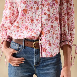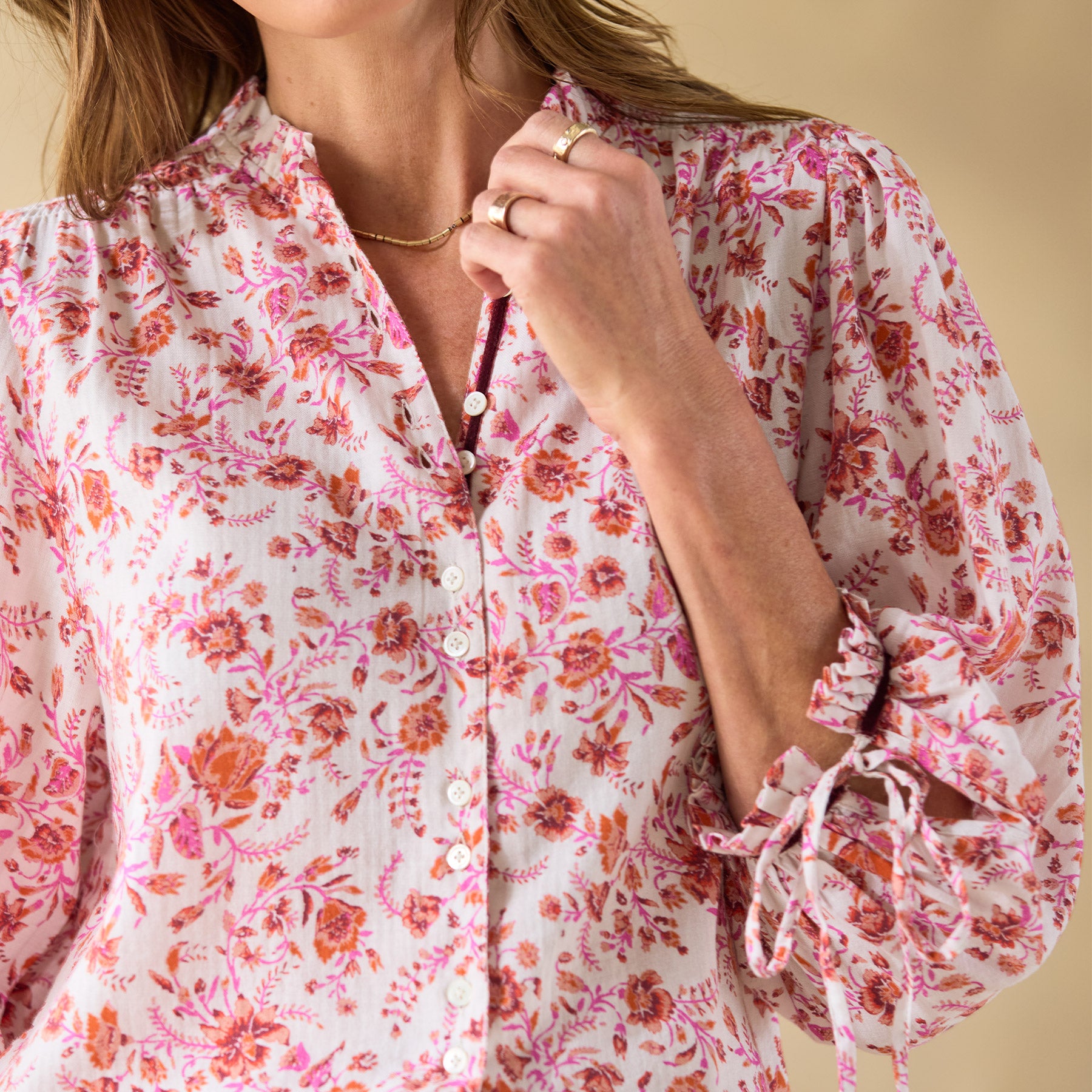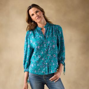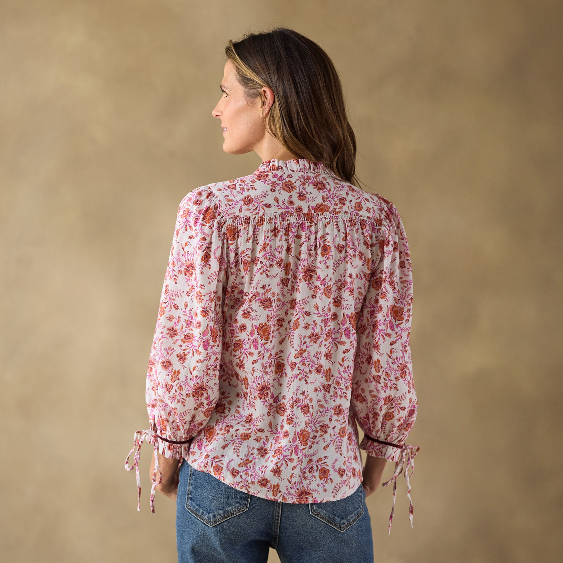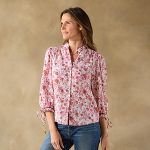 So easy??our feminine top is as beautiful as it is relaxed with button-down front. ruffle details at the neckline and bracelet length cuffs. contrast velvet trim and two lovely rows of smocking. Adjustable ties at the cuffs. Cotton. Machine wash. Imported. Exclusive. Sizes XS (0?C2). S (4?C6). M (8?C10). L (12?C14). XL (16?C18). XXL (20?C22). Approx. 25l.