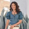 Embrace the effortless sophistication of this button-down top with the loveliest details: eyelet hem and sleeves. scalloped collar and hem. back yoke. and natural shell buttons. Matching camisole included. Cotton. Machine wash. Imported. Exclusive. Sizes XXS (00). XS (0-2). S (4-6). M (8-10). L (12-14). XL (16-18). Approx. 22.5l.