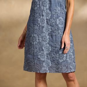 Easy and elegant. this flowing shift dress in vintage-inspired washed indigo is embellished with tonal floral embroidery. Fully lined. with keyhole button back. Ramie/Cotton. Hand wash. Imported. Sundance exclusive. Sizes XS (0??). S (4??). M (8??0). L (12??4). XL (16??8). XXL (20??2). Approx. 38.5l