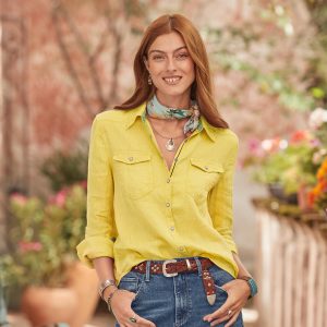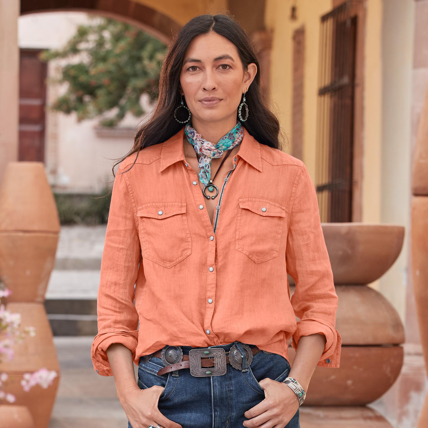 Sundance’s favorite classic Western shirt with contrast floral print inside and twill tape detail at the placket. Snap button front. two front patch pockets with snaps. Linen. Machine wash. Imported. Exclusive. Sizes XXS (0). XS (0-2). S (4-6). M (8-10). L (12-14). XL (16-18). Approx. 24.5l.